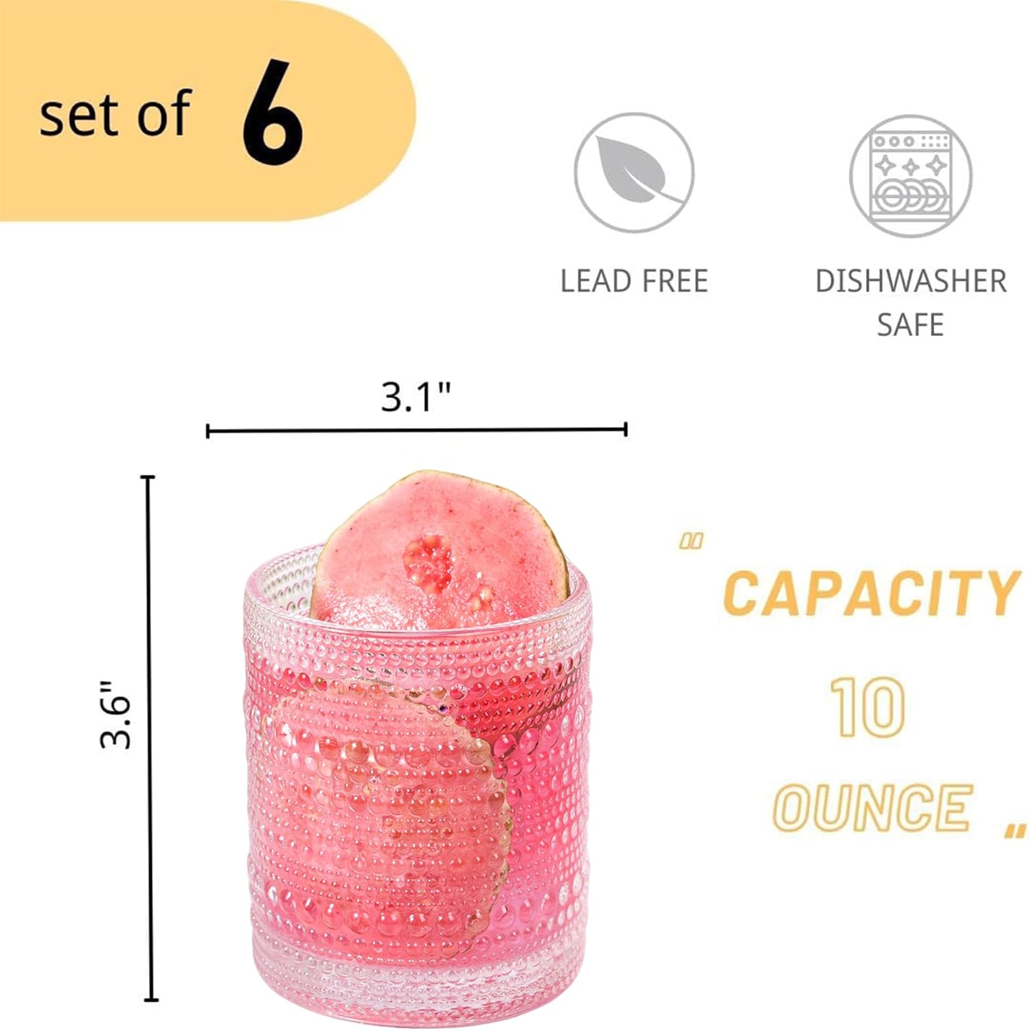 • 【Package Details】Embossed Drinking glasses & Water glasses set of 6, Each bubble glass measures 3.1 x 3.6 x 3.1 inch, 10 ounce capacity